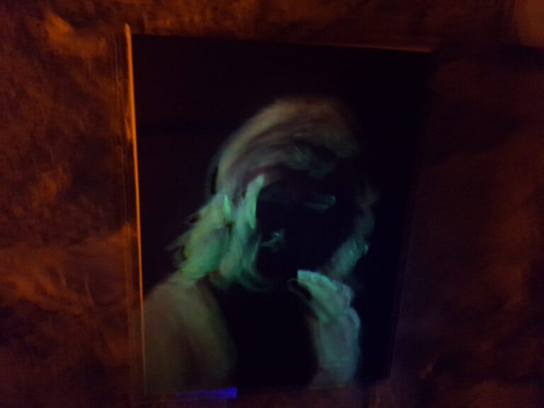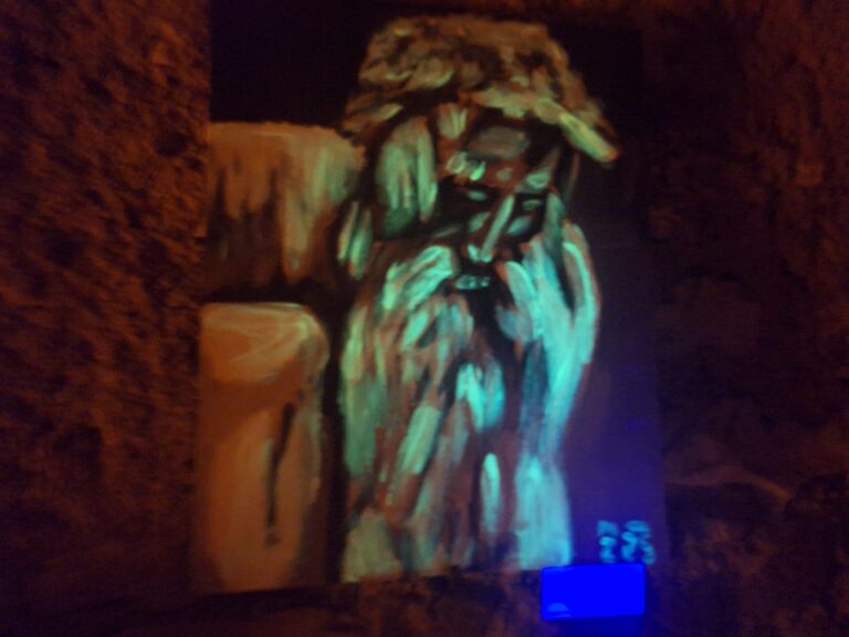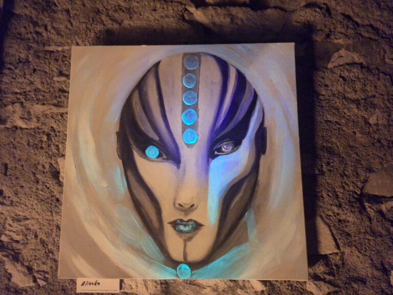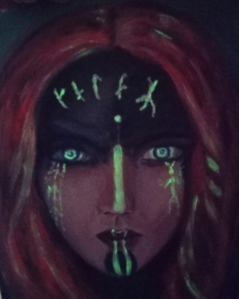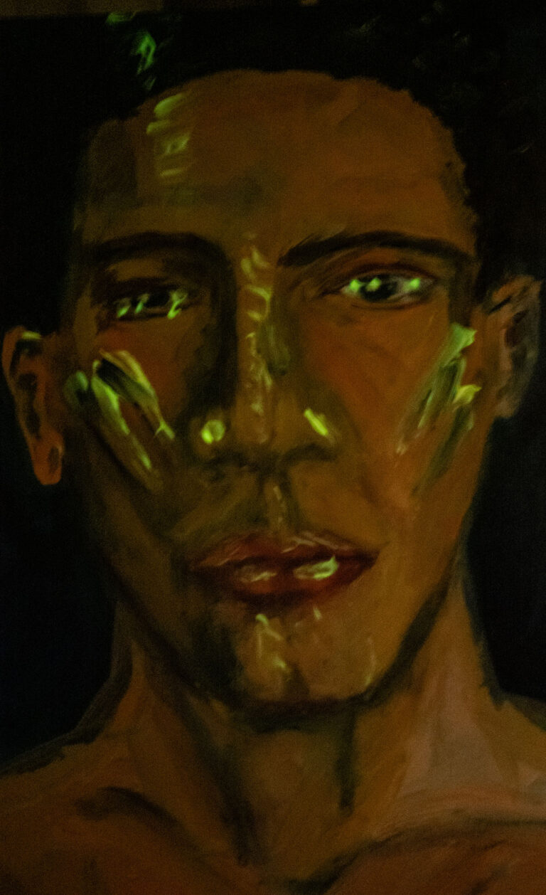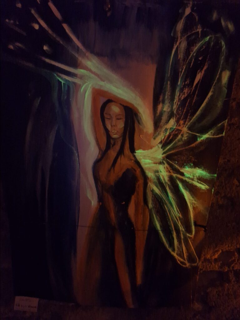 Došlo mi, že lidé uvidí obrazy jen ve večerních hodinách, a jelikož je club ve sklepních prostorech budovy z 15. století, také jen ve tmě. Takže mě napadla idea, že udělám svítící obrazy a spojím to s tématem, který vychází z programu clubu – tedy z tance. Rytmus máme všichni v těle. Lidé odnepaměti sedávali u ohně a bubnovali na šamanské bubny. Je nám to vlastní – jako rytmus tlukotu srdce. Obrazy mají vrstvu fosforeskující barvy. Svítí pod UV osvětlením.